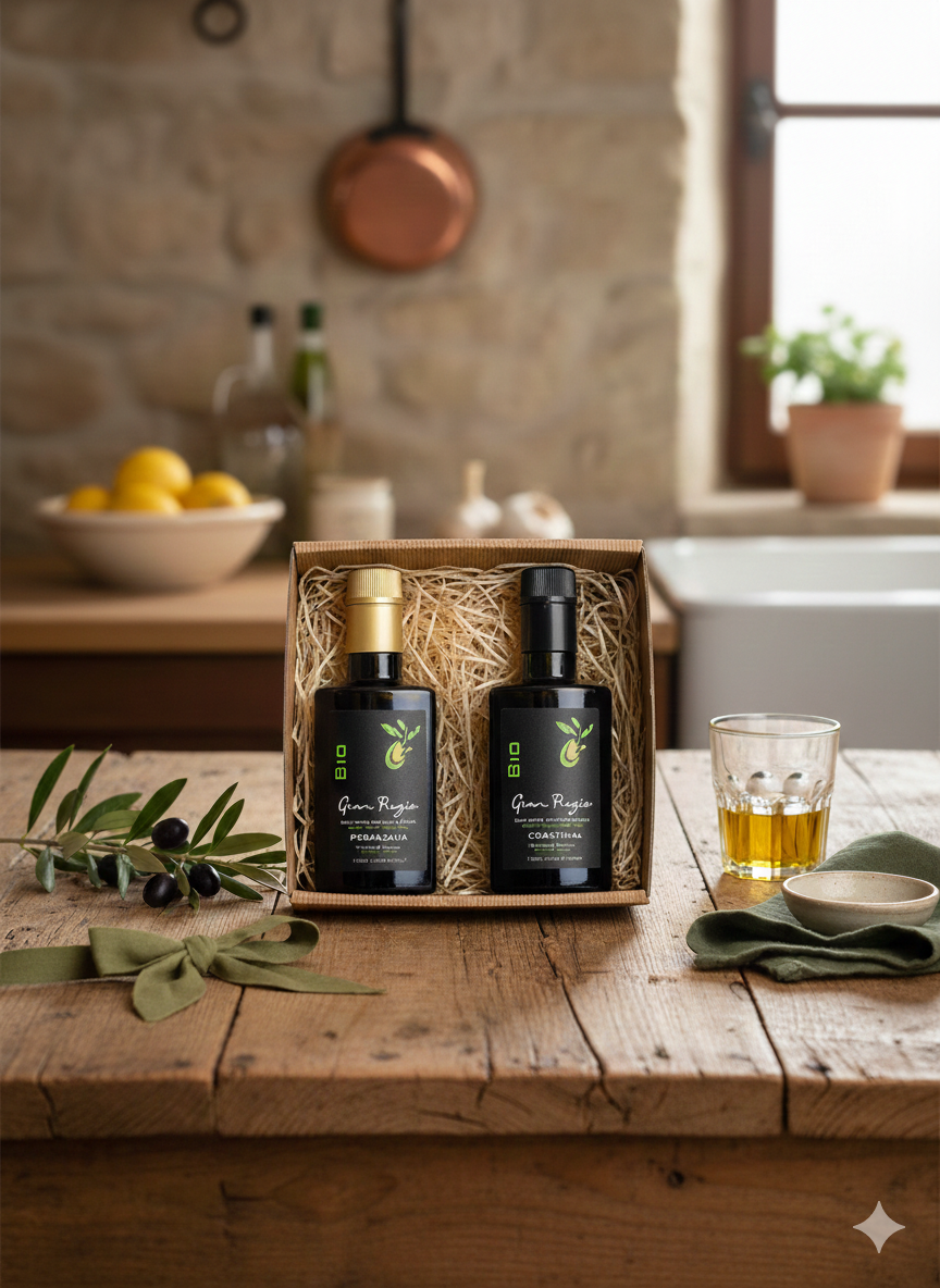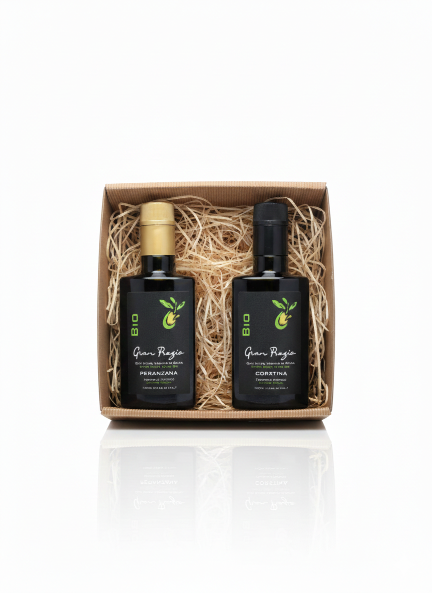Szukasz wyjątkowego, zdrowego prezentu? Elegancki Zestaw Prezentowy Gran Pregio to dwie butelki (2x250ml) certyfikowanej włoskiej oliwy BIO Ultra Premium prosto z Apulii, gotowe do wręczenia w stylowym kartoniku z naturalnym wypełnieniem.